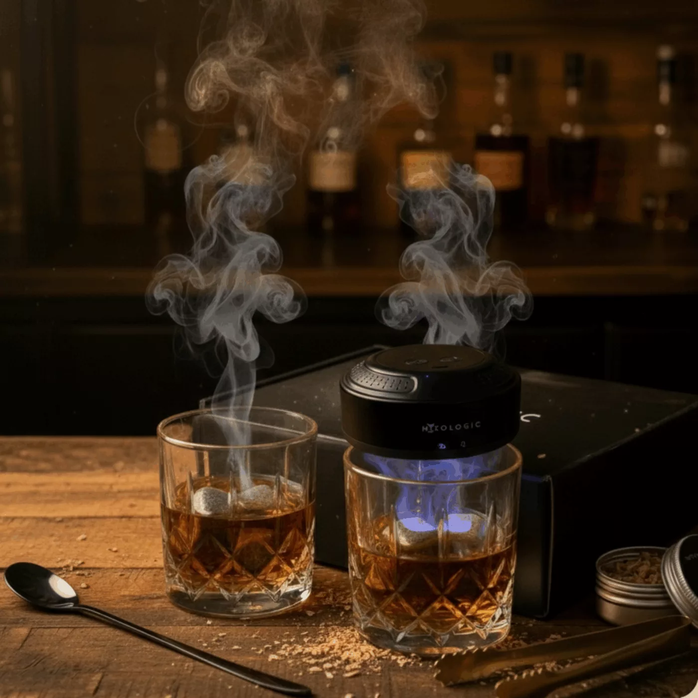 An electric, Type-C rechargeable cocktail smoker with LED lighting, including two glasses and six wood chip flavours & other accessories for easy, flame-free drink smoking.