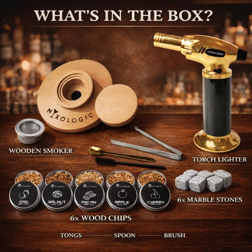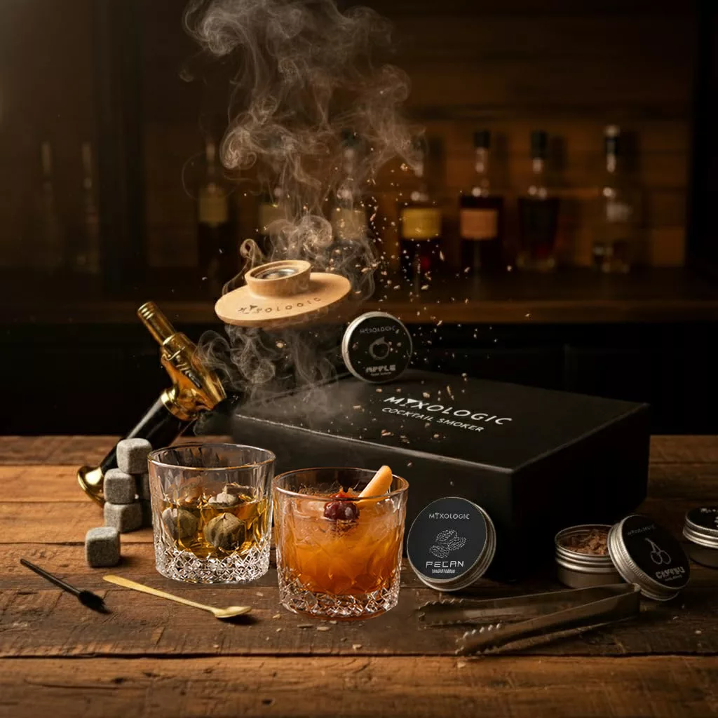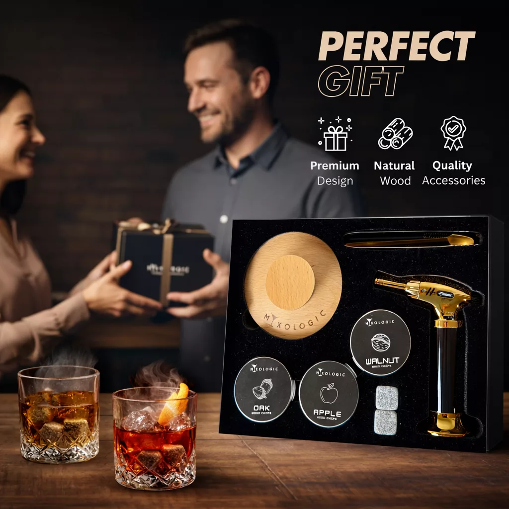 A REMARKABLE WHISKEY GIFT SET perfect as valentines gift for him or her. This finely curated set, ideal for boyfriends, dads, or husbands, includes the drink smoker with all accessories elegantly hand-packaged as a luxurious cocktail gift set. Enhance your collection of cocktail accessories with MIXOLOGIC’s premium quality drinks smoker, delighting your guests with flavorful smoked cocktails!